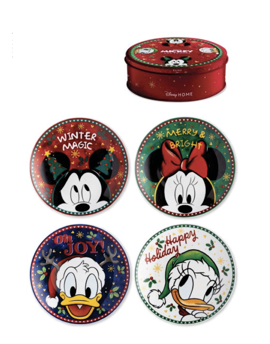 Maak de feestdagen nóg gezelliger met deze prachtige set dessertbordjes uit de Disney Winter Magic-collectie van Egan. Mickey, Minnie, Donald en Katrien hebben ieder hun eigen bordje en tekst. De set wordt geleverd in een fraaie bewaardoos. De Gebaksbord Disney Christmas -set is gemaakt van porselein en is geschikt voor vaatwasser en magnetron.