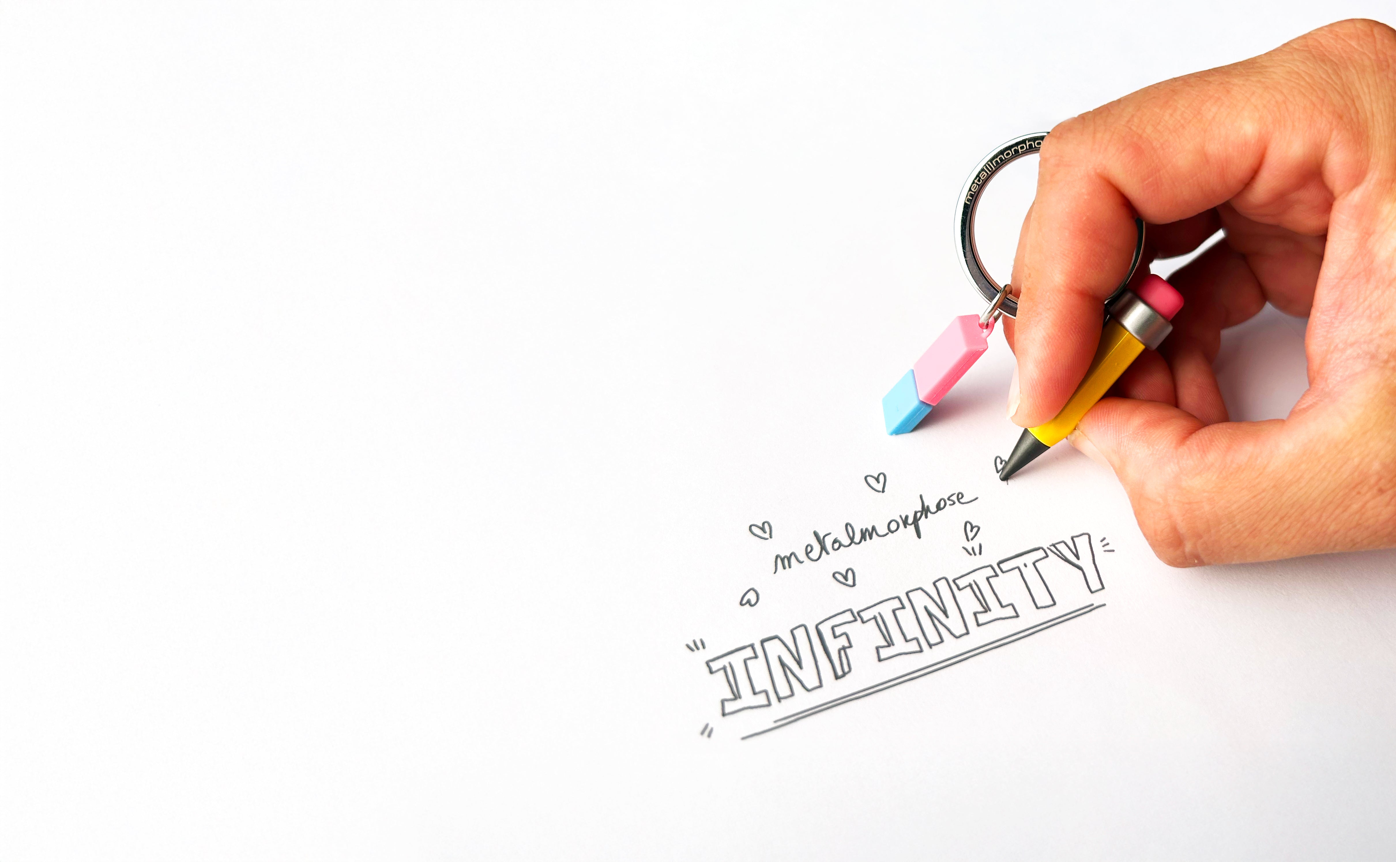 Metalen sleutelhanger van een functionele gum en een potlood met oneindige punt