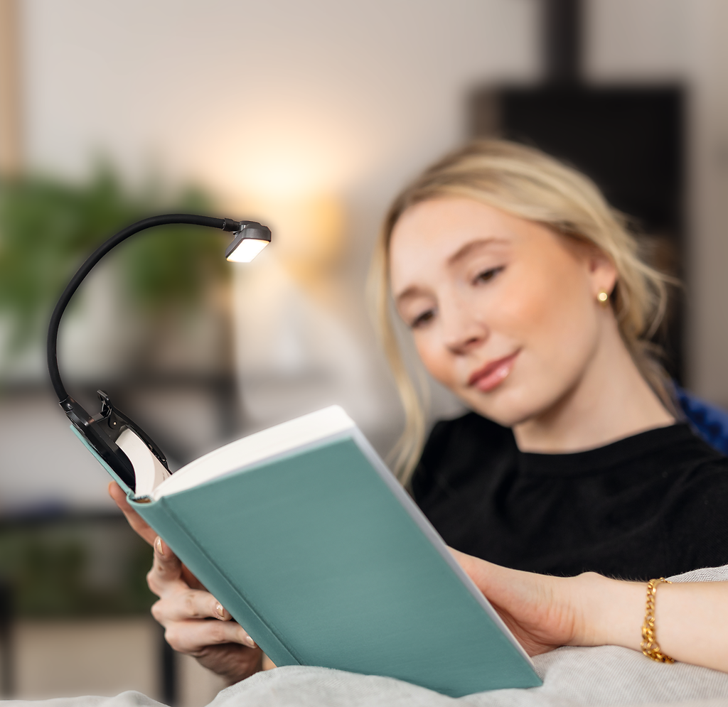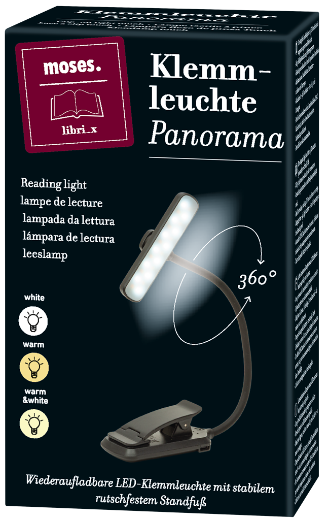 Panorama clip leeslamp met 24 Leds en 3 kleur temperaturen (warm wit, neutraal wit en koel wit) en dimfunties. Met 360 graden draaibare panoramische lichtknop, flexibele hals, anti slipvoet en stabiele klem is dit de ultieme leeslamp.