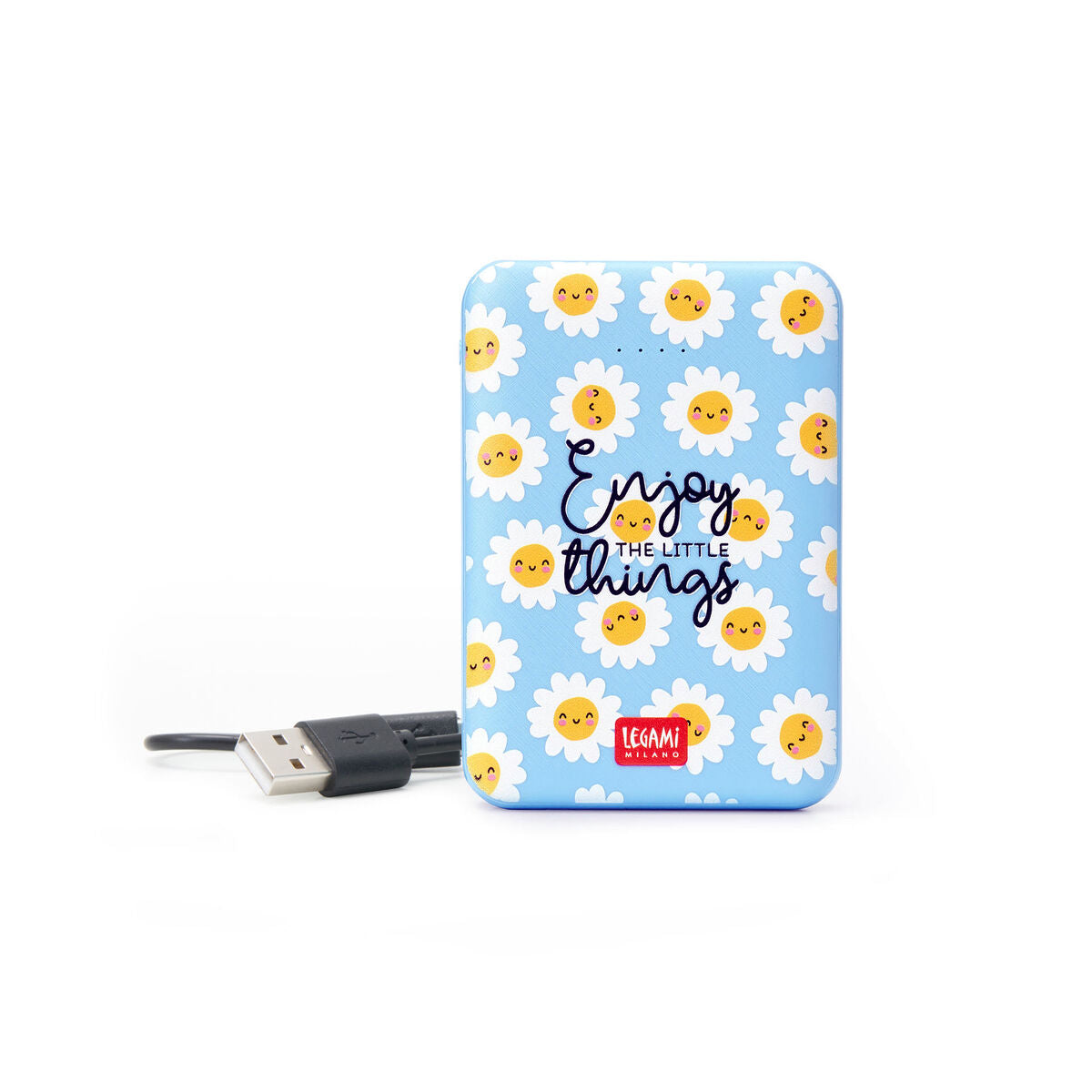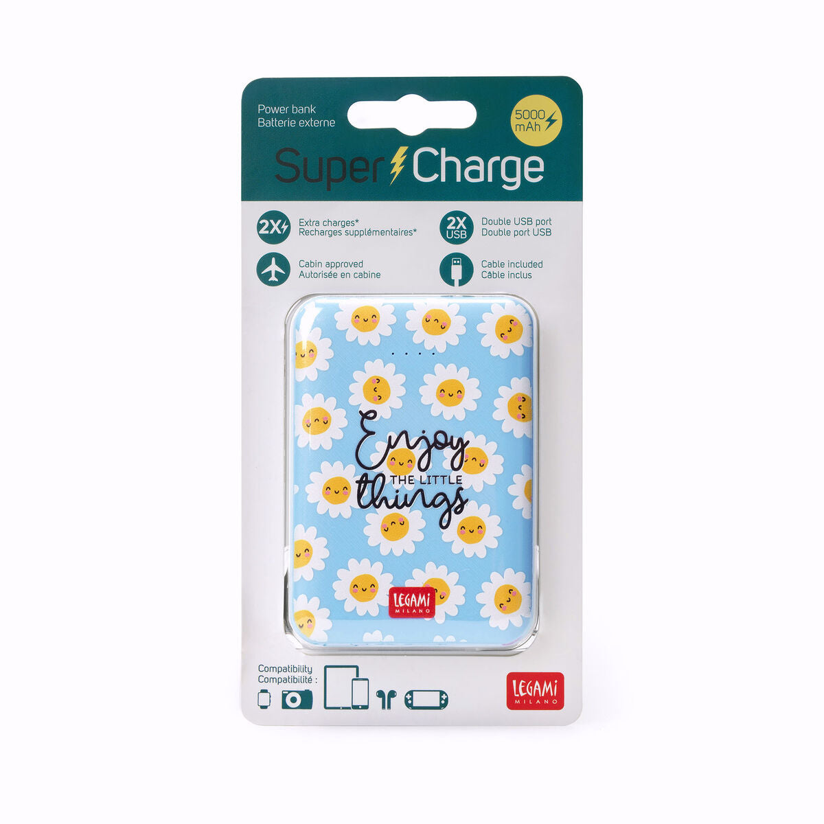 De Legami Supercharge Portable Power Bank - Daisy is een essentieel reisaccessoire dat de goedgekeurd en krachtig genoeg is om maximaal twee apparaten tegelijkertijd op te laden. Met een handige LED -lichtbatterij-indicator, twee USB -poorten en één micro -USB -poort, is dit essentiële stukje technologie compatibel met smartphones, tablets, digitale camera's.