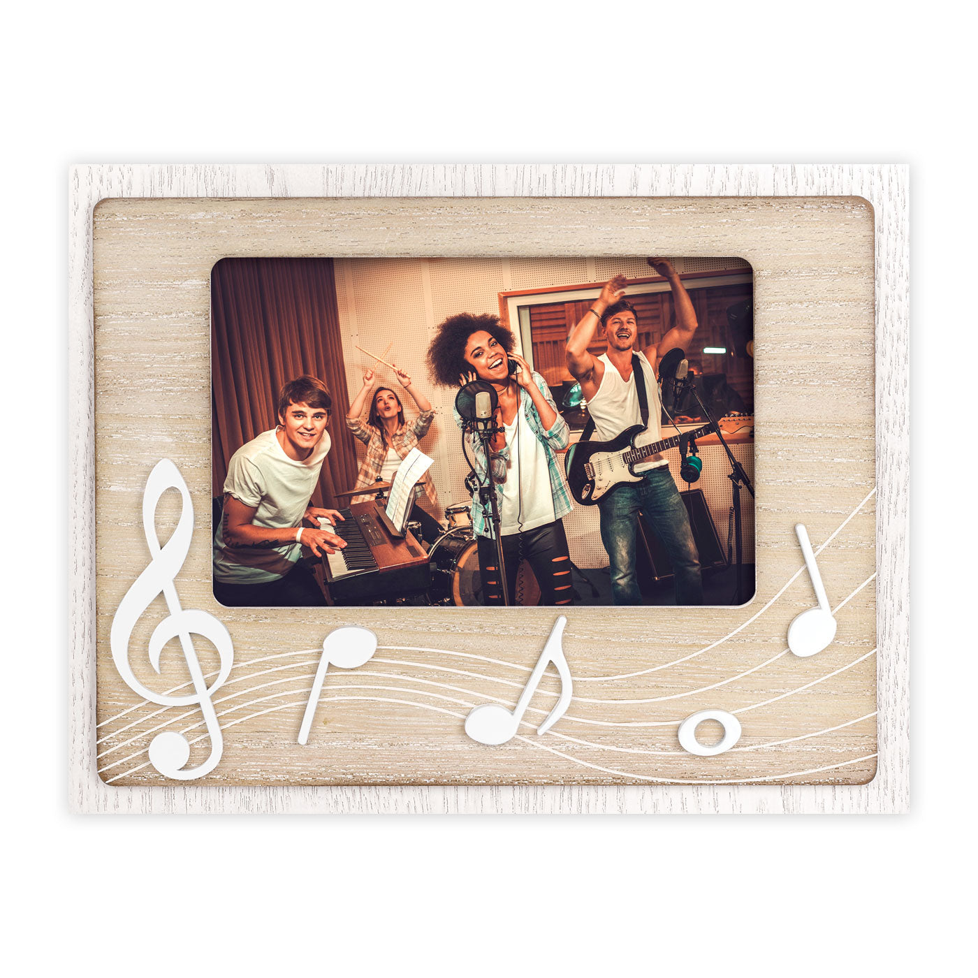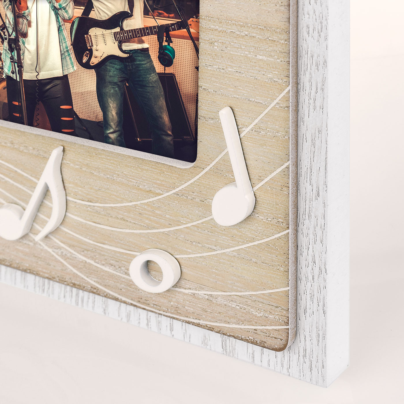 Houten lijst 'Lyra' in wit en bruin, met muzieknootvormige decoraties en witte notenbalken.