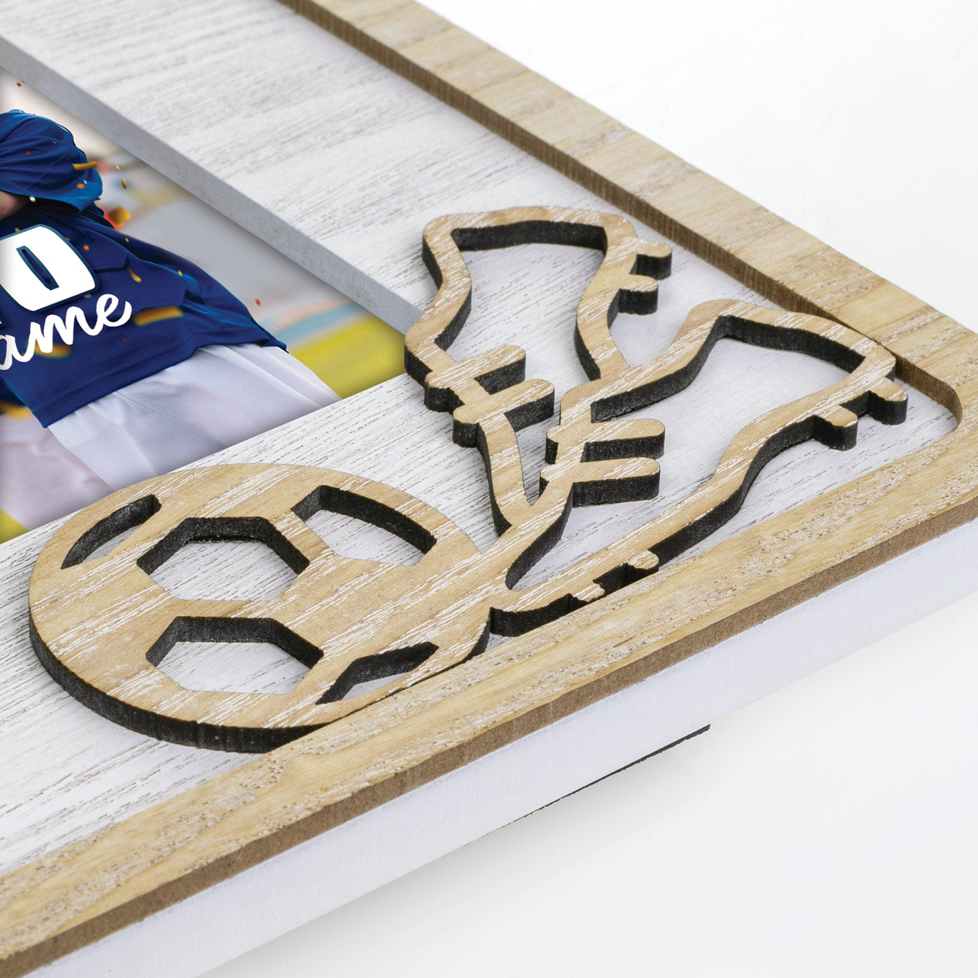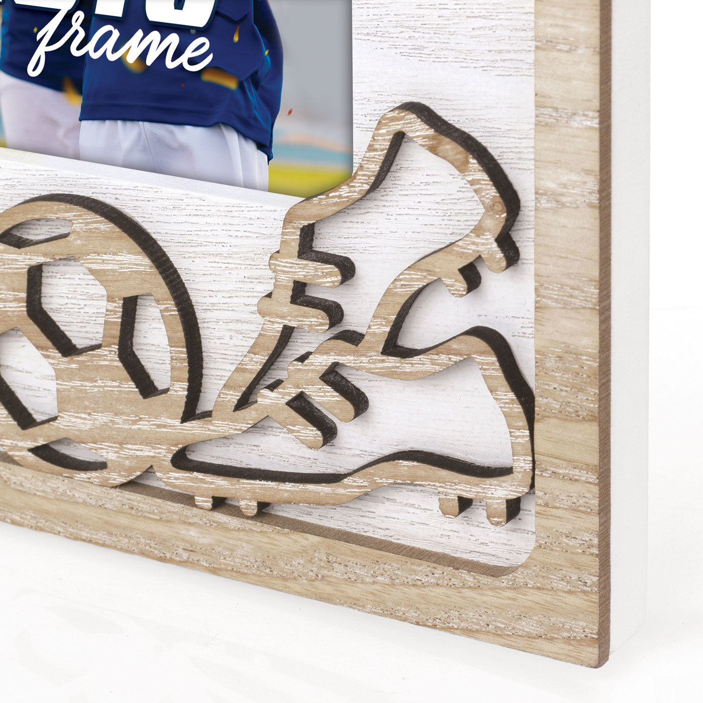 Houten lijst 'Maradona' in wit en bruin, met reliëfdecoratie van een bal en voetbalschoenen.